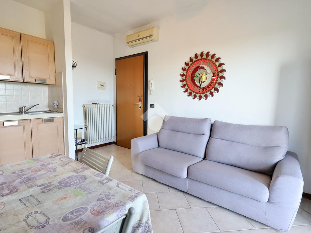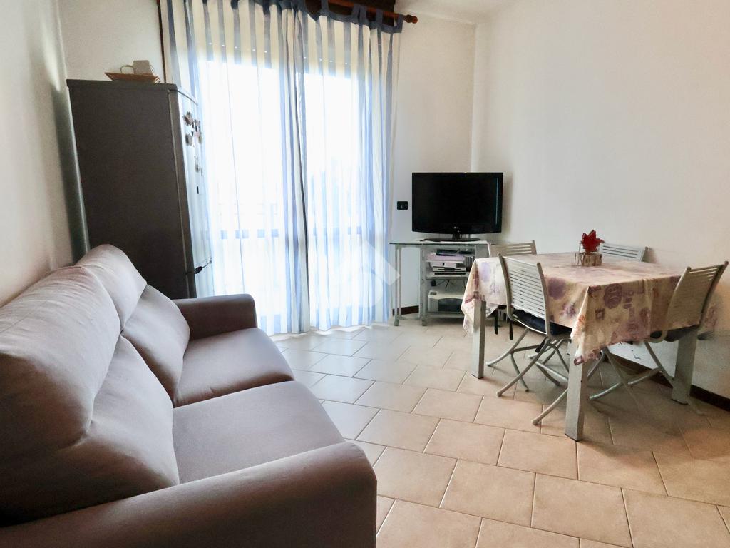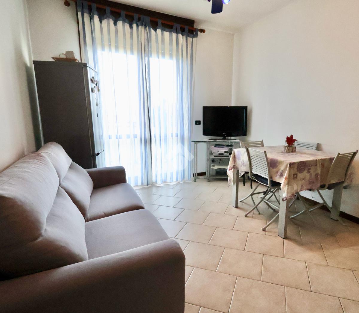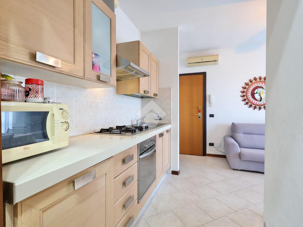 L'ingresso si apre su un accogliente soggiorno con angolo cottura, dal quale si accede a un ampio terrazzo di circa 10 mq. La zona notte comprende un disimpegno, una camera matrimoniale, una camera singola e un bagno finestrato con box doccia.