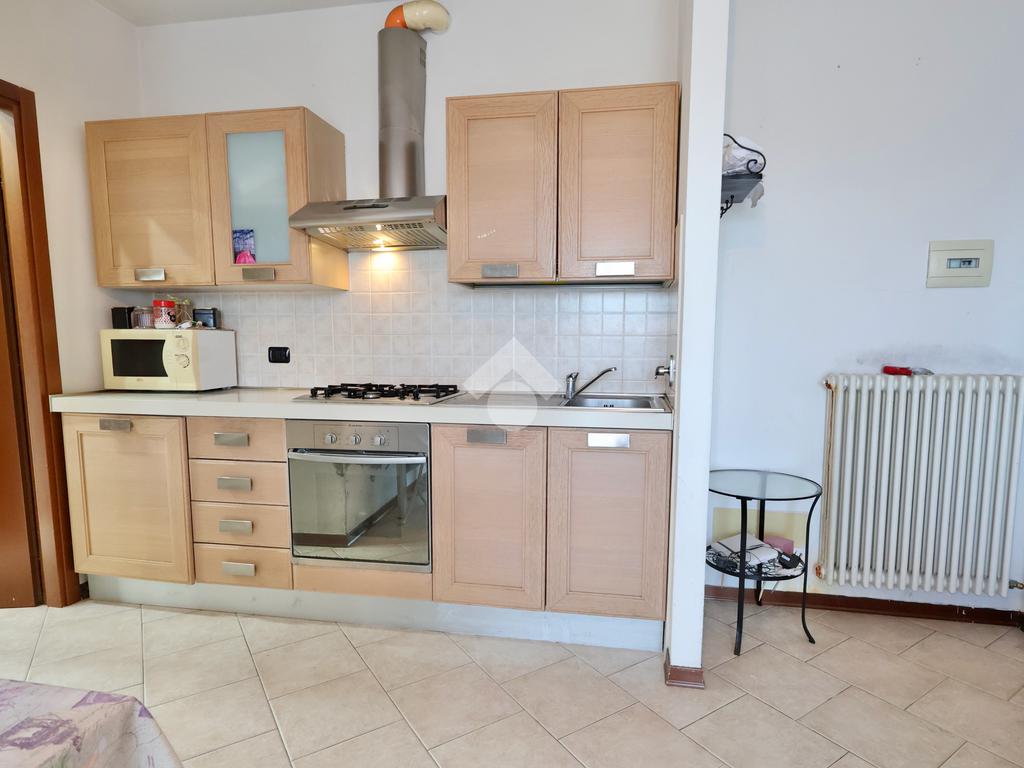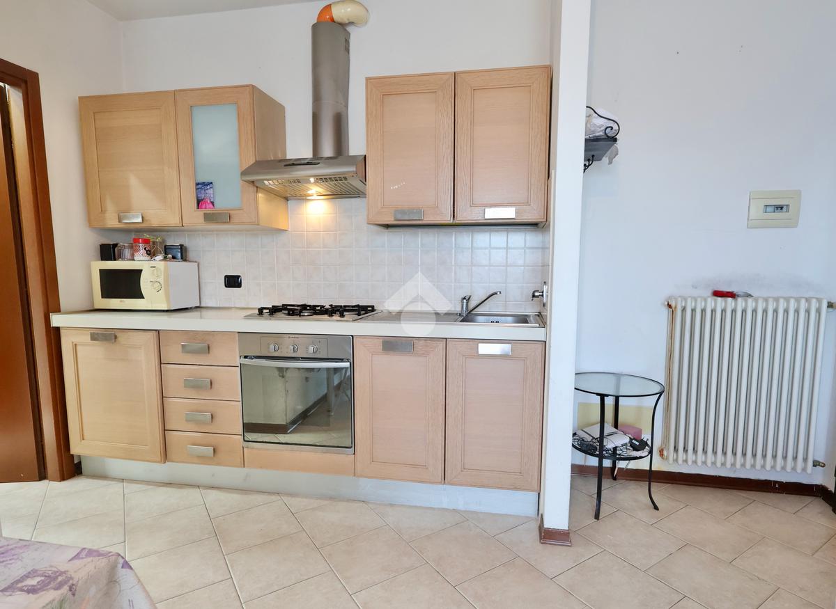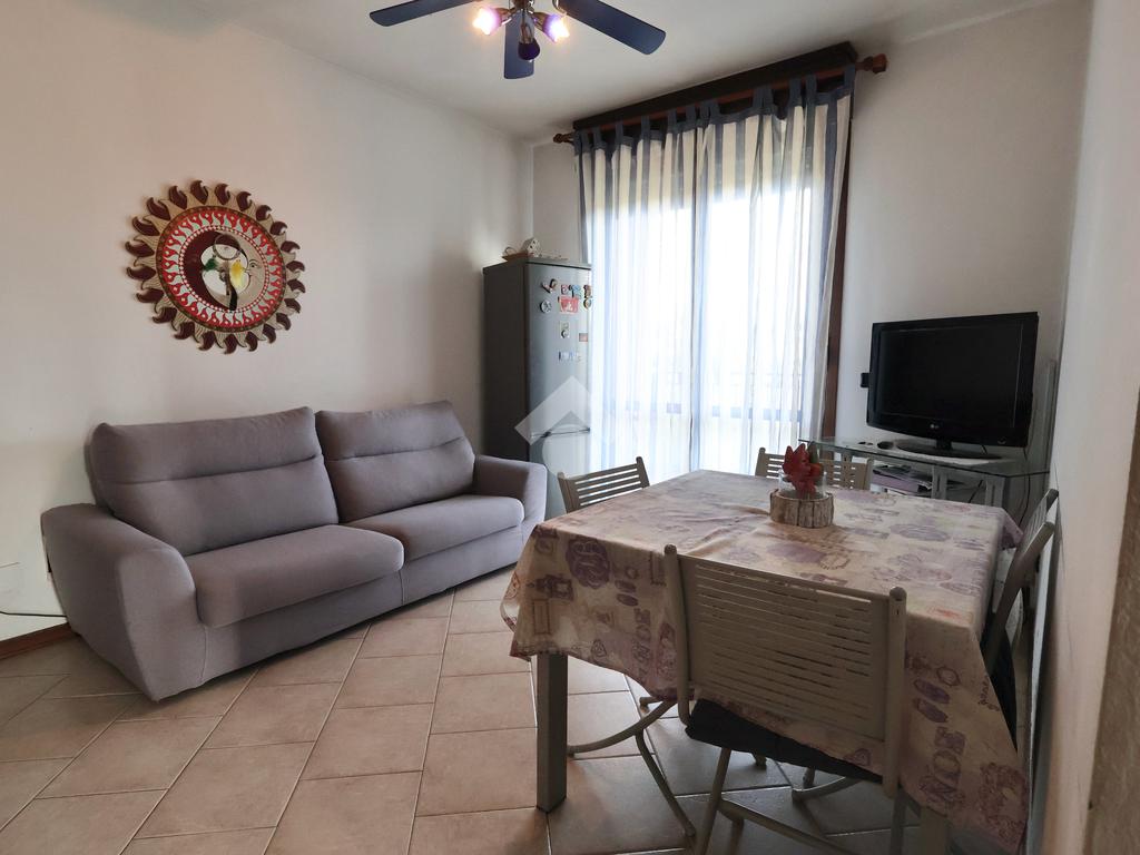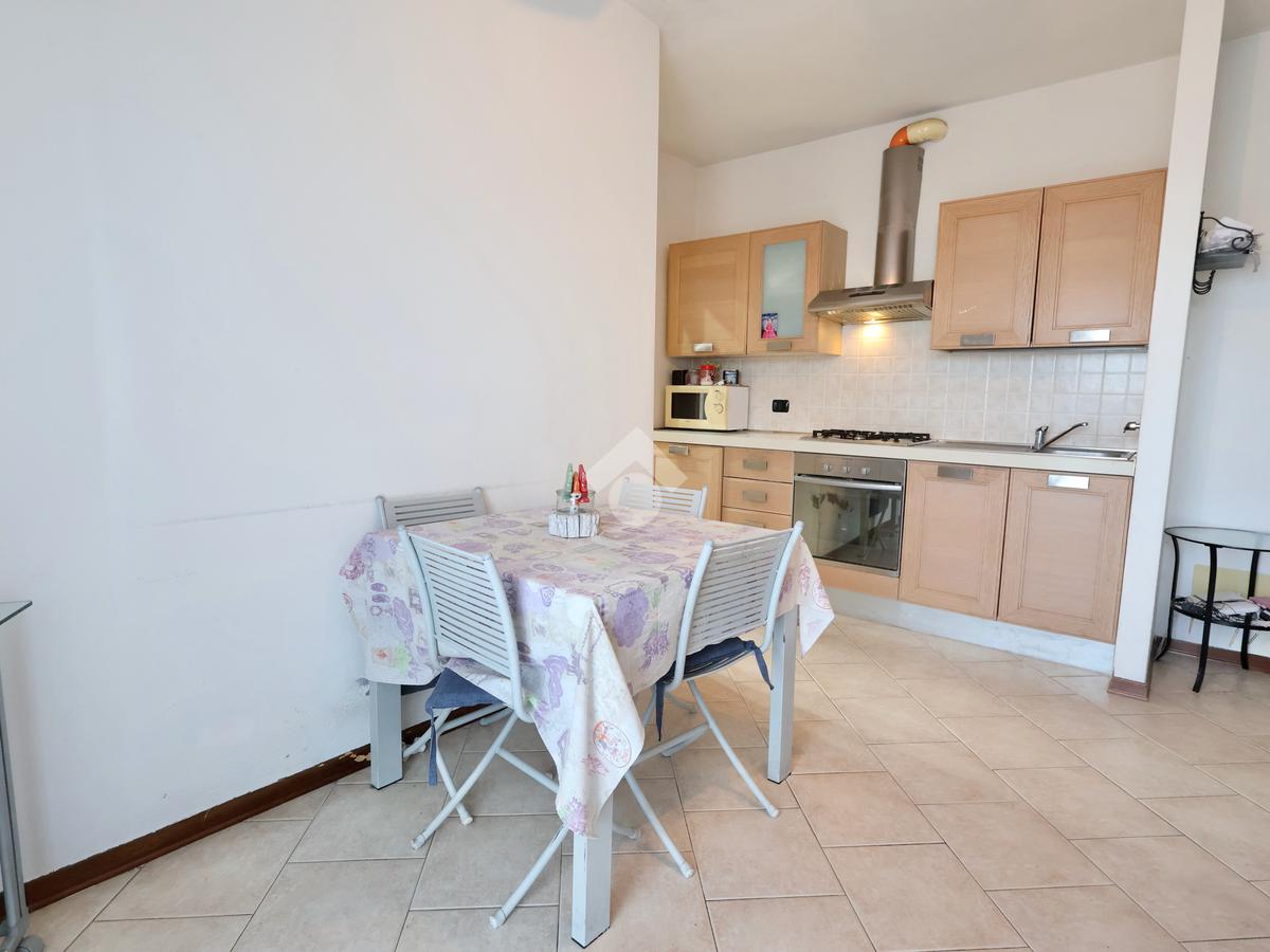 L'ingresso si apre su un accogliente soggiorno con angolo cottura, dal quale si accede a un ampio terrazzo di circa 10 mq. La zona notte comprende un disimpegno, una camera matrimoniale, una camera singola e un bagno finestrato con box doccia.