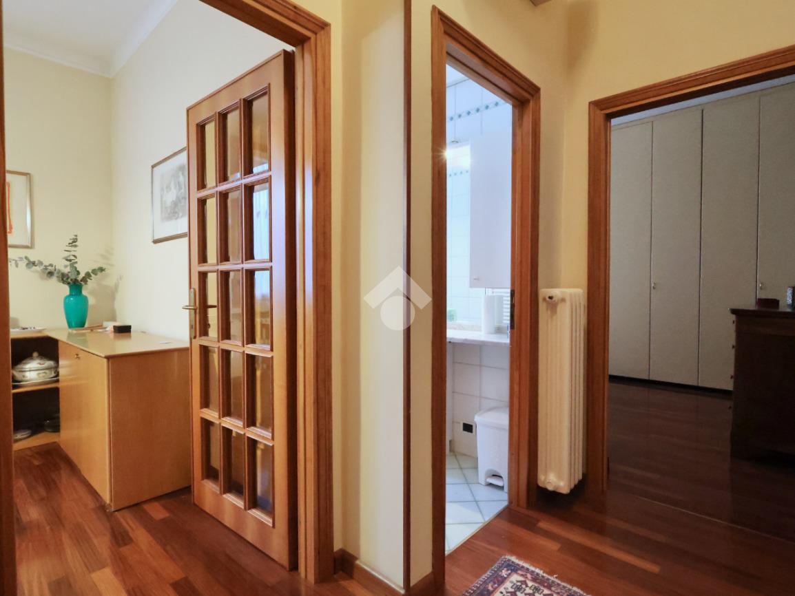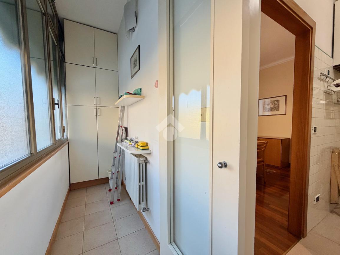 La distribuzione dei vani prevede l'ingresso, sala da pranzo, cucinotto con balcone verandato, salotto (o seconda camera da letto) camera da letto matrimoniale, bagno finestrato soggiorno, cucinotto con balconcino, due camere da letto di cui una con balcone e bagno finestrato con doccia.