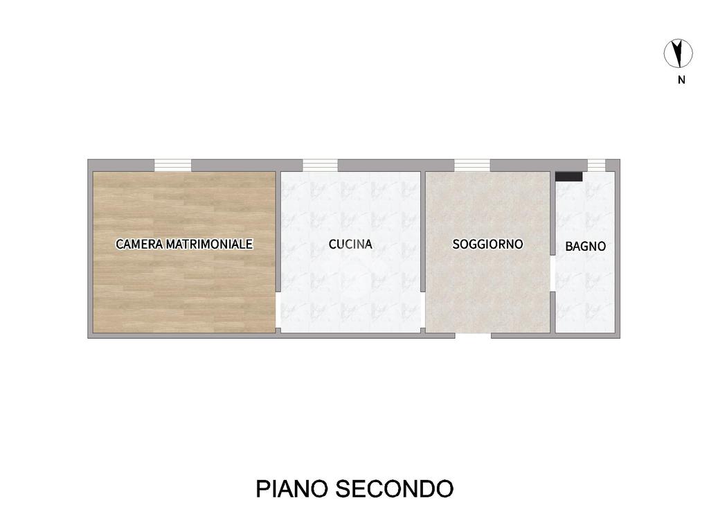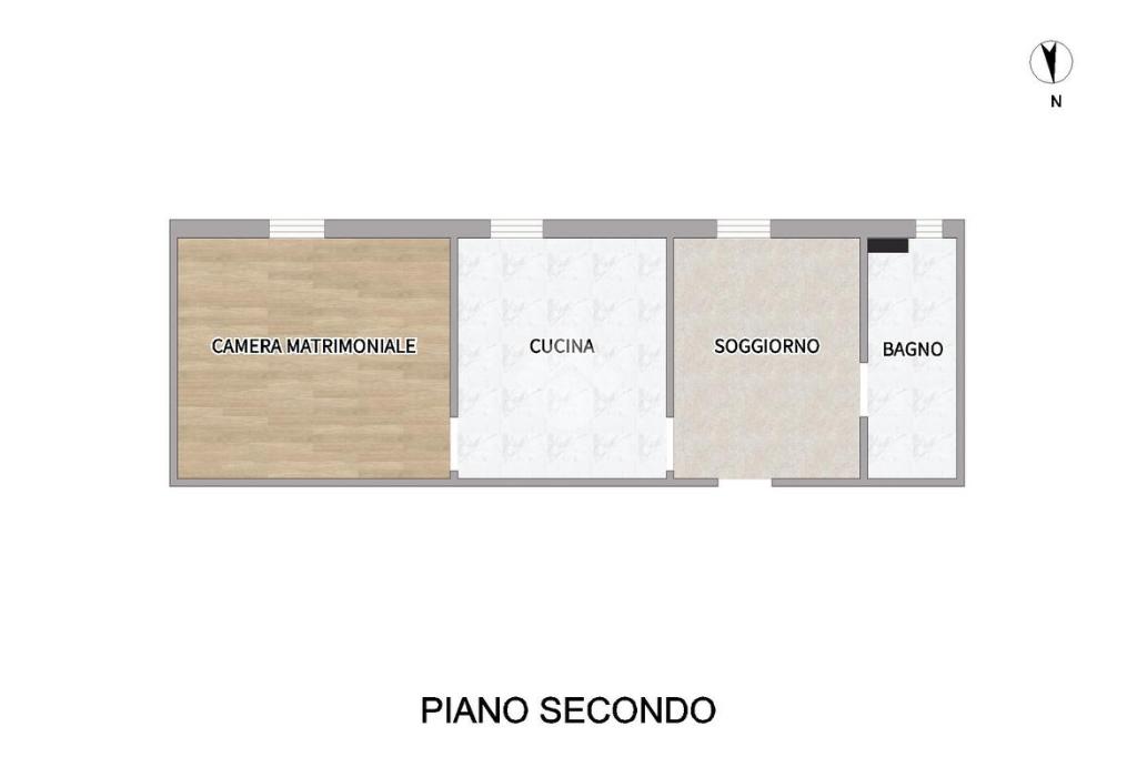 La distribuzione dei vani prevede: l'ingresso su soggiorno collegato direttamente alla cucina, camera da letto matrimoniale e bagno con finestra.